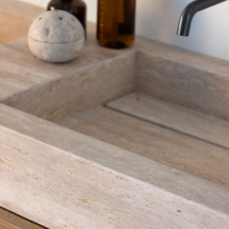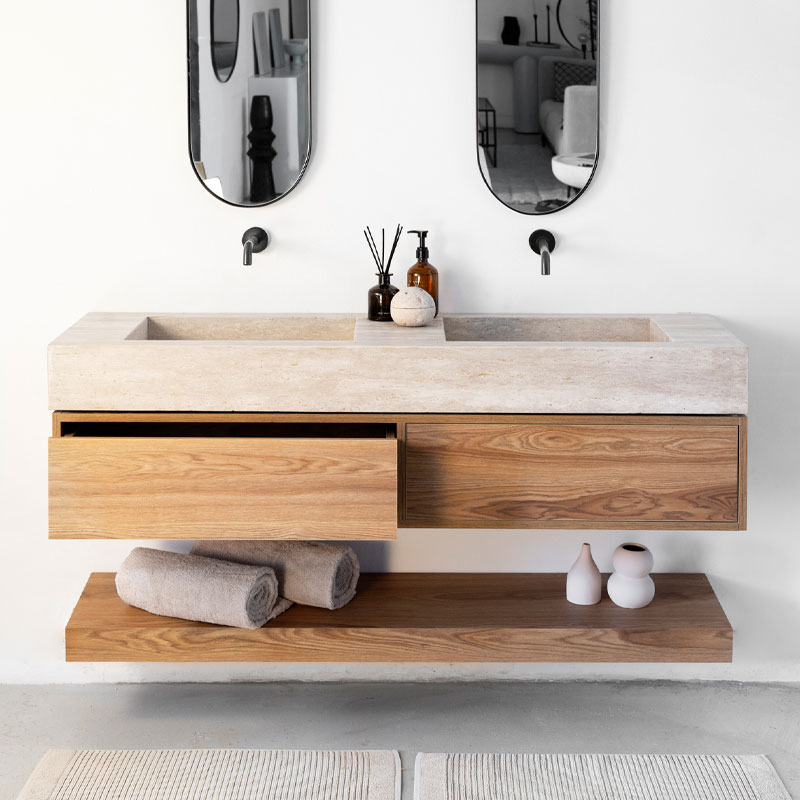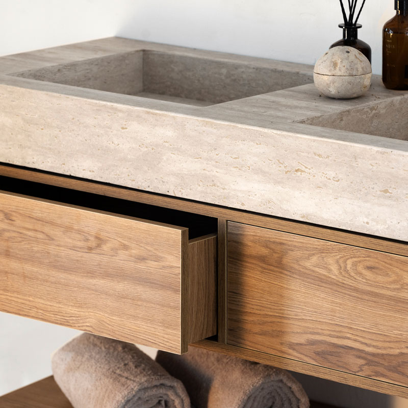 Notre modèle Sienna, se compose d’une double vasque en travertin et d’un meuble en bois comportant deux tiroirs et une étagère.